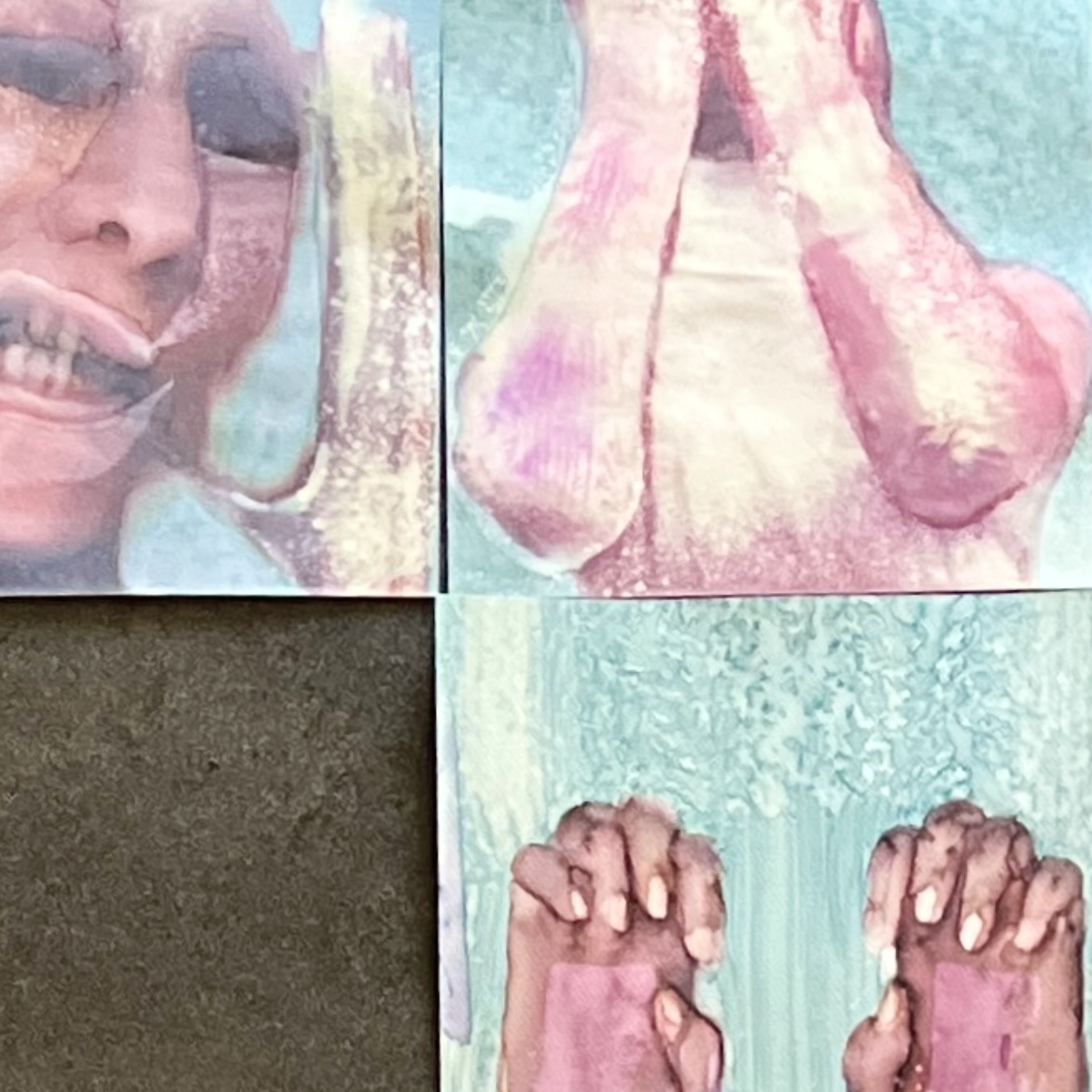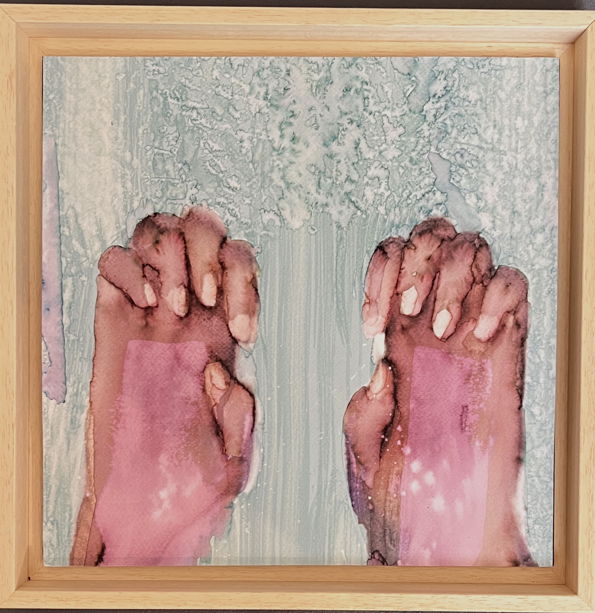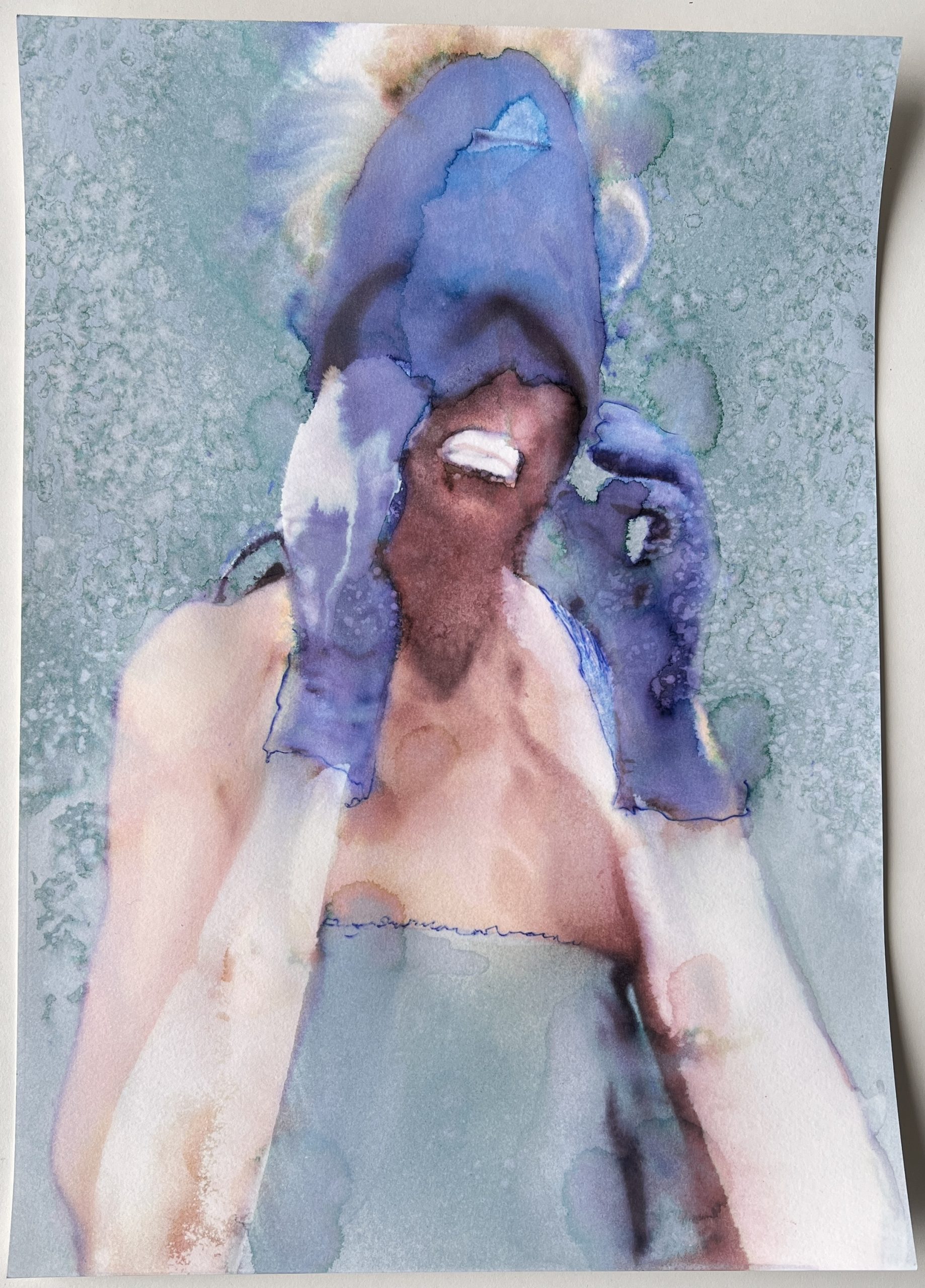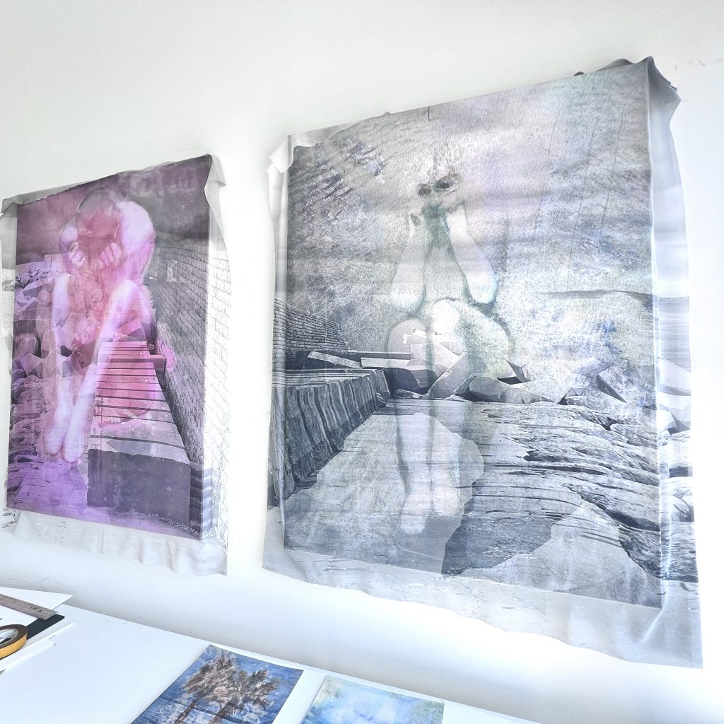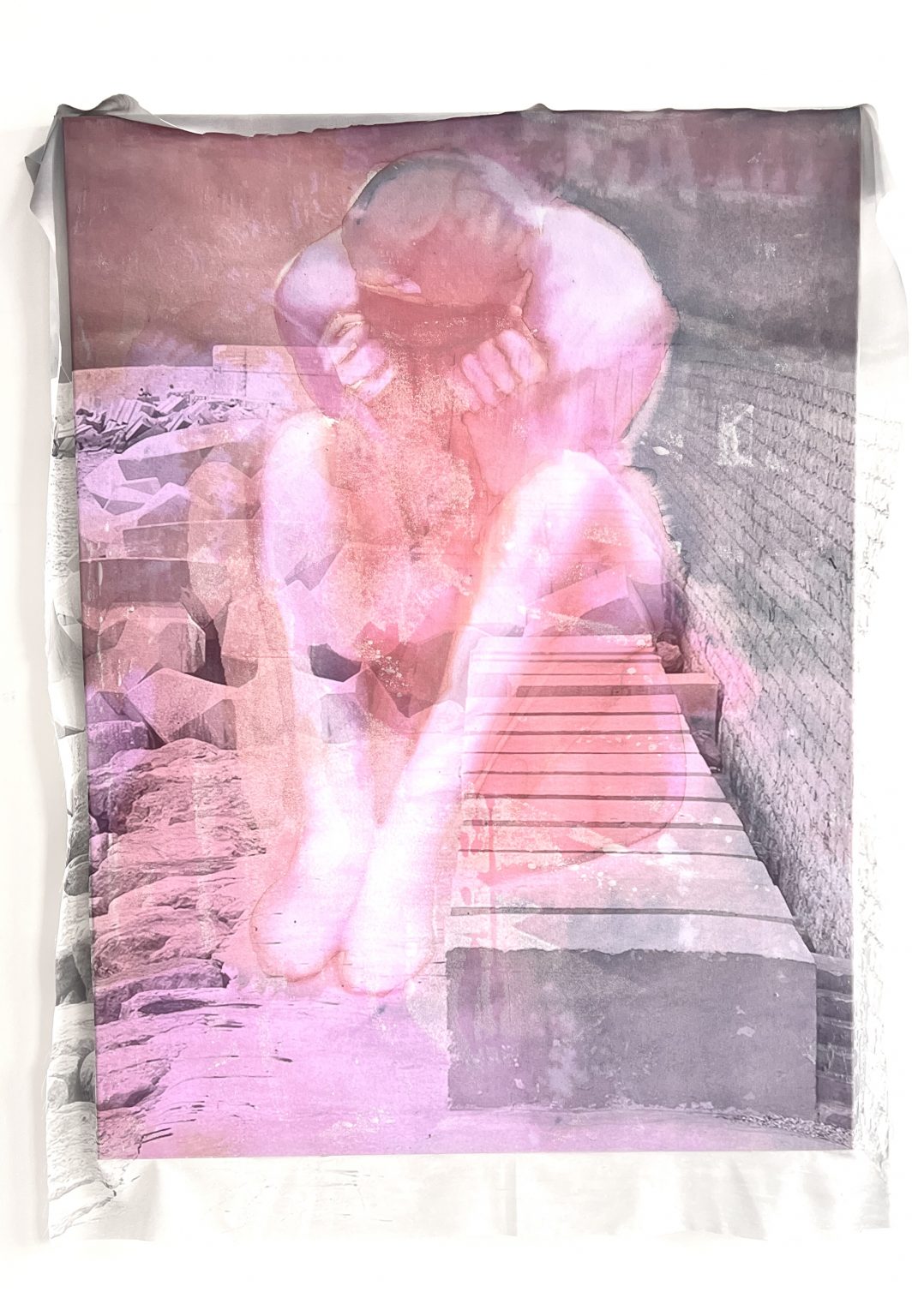 « Son coeur bar dans sa tête et ça prend toute la place » #1. Encres, aquarelle, solvants, sur papier Fine Art. Marouflage d’une impression photographique sur voile transparent. 120X90 cms