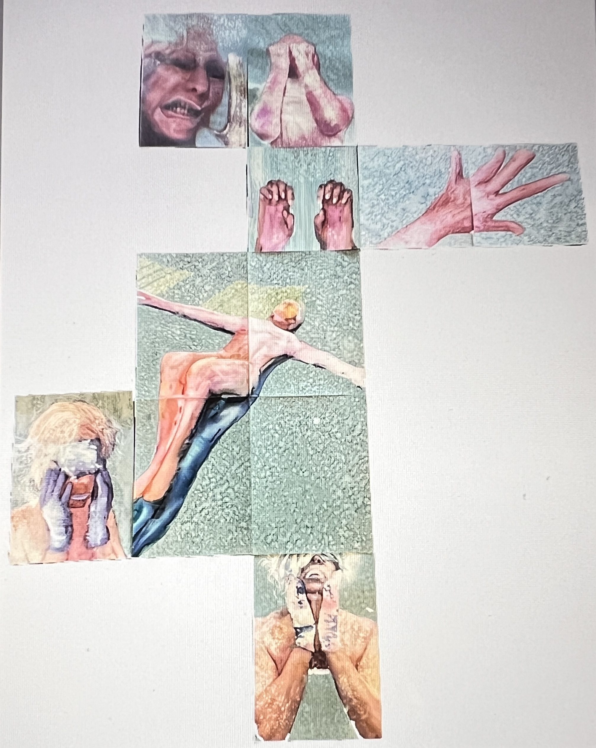 « Her heart beats in her head and it takes up all the space« . Inks, watercolor, solvents, on canvas. Mouting of a photographie print on transparent veille.